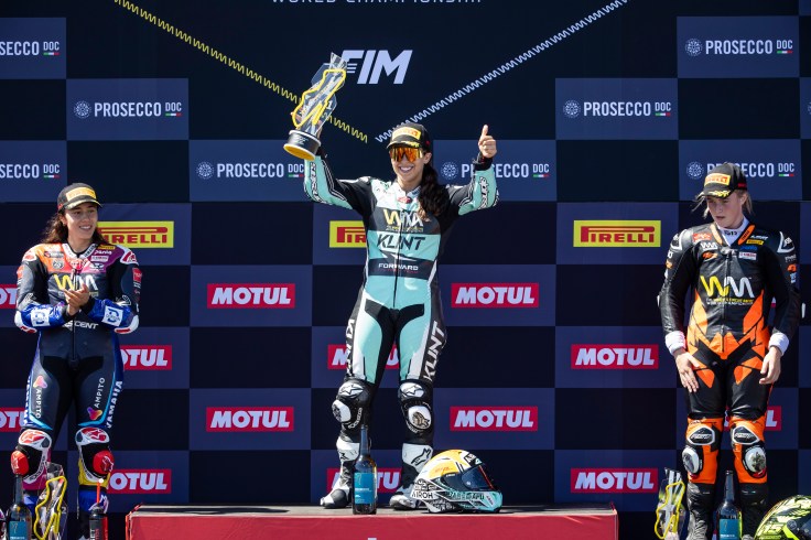 去年Maria并没有第一时间出现在WorldWCR首赛季的参赛名单中,但这并不是因为她不想参与这项创造历史的赛事,只是因为她还在想办法为自己组队。“2023年十月我就在努力加入WorldWCR,但是那时我还没有车队。后来我直接找了我在MotoE的车队Klint Forward车队,他们同意支持我参加WorldWCR。因为来得有点晚,我只测试了一次赛车,不过在米萨诺的头两场比赛我还是都拿了冠军。”